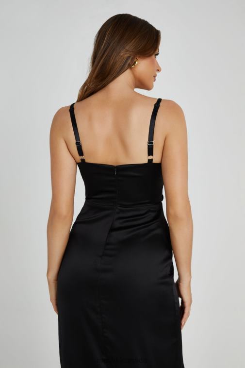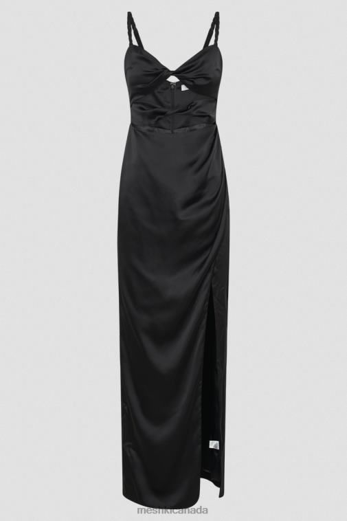 CLEO is a sexy, sleeveless, satin black dress with a sweetheart neckline and adjustable shoulder straps. The bust cups are slightly ruched and twisted in the centre with a mid-centre backline that closes via a standard hook and eye zipper. A twisted bodice panel sits right beneath the bust cups to create a sort of custom cut-out look while the maxi skirt has a front side slit and three pleats at the side seam to create a draped look. The shoulder straps are thin and braided at the front, adding to the dress's visual texture.